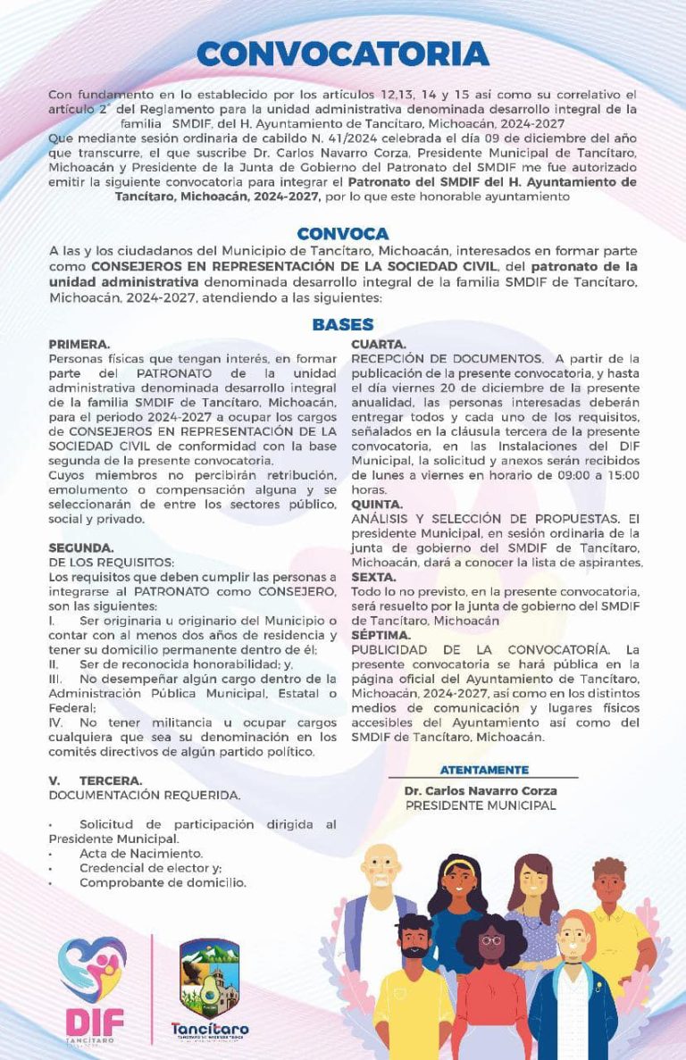 Convocatorias H.Ayuntamiento lanza Convocatoria para Formar parte del Patronato del SMDIF admin 11 meses atrás