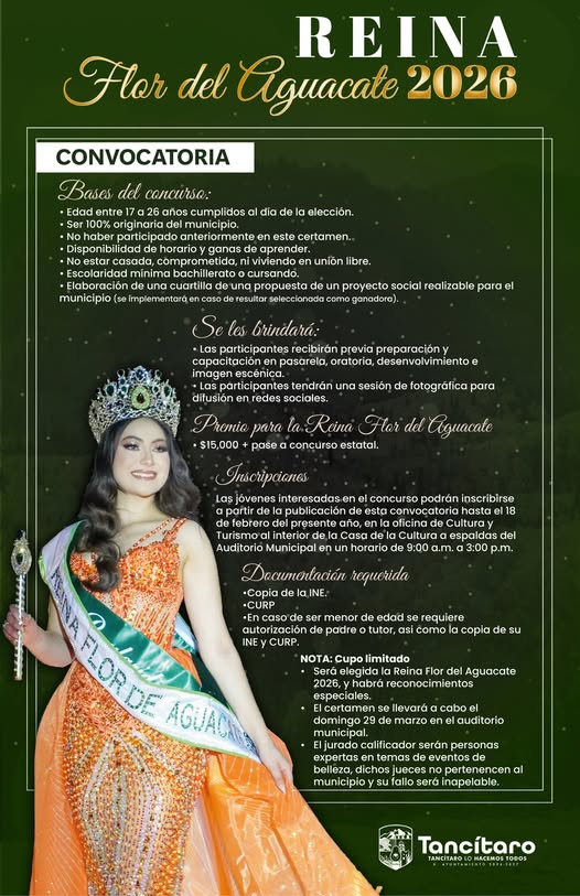 Eventos 3 horas atrás CERTAMEN REINA FLOR DE AGUACATE 2026 09 de Febrero de 2026 El H. Ayuntamiento de Tancítaro 2024–2027, encabezado por el Dr….