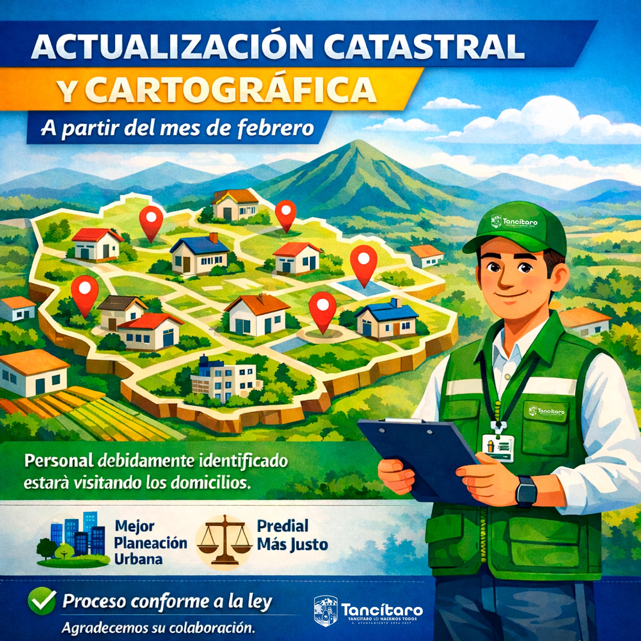 El H. Ayuntamiento de Tancítaro, presidido por el Dr. Carlos Navarro Corza, a través de la Dirección de Desarrollo Urbano y Catastro, informa a la población que durante el mes de febrero se estará llevando a cabo la actualización catastral y cartográfica en nuestro municipio.